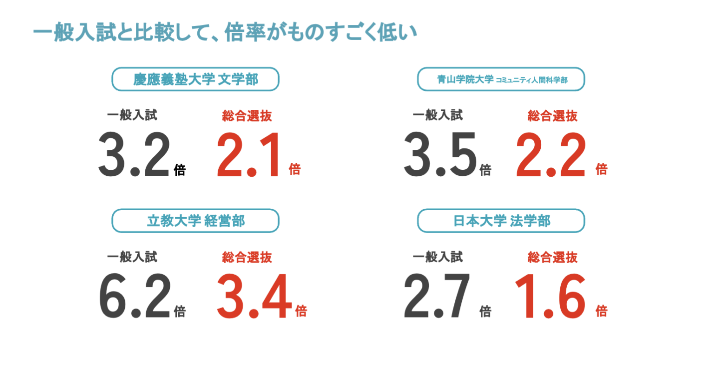 その理由は、上記の画像からもわかるように、総合型選抜は一般受験に比べて志願者数が少なく、合格倍率が低いためです。