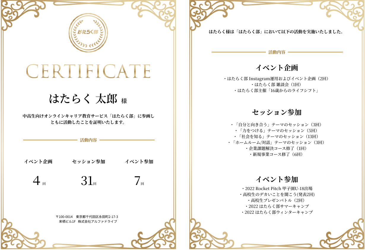 下記の画像のようにあなたが参加した活動や内容を証明書として大学に提出できるので、自身の大きな武器の一つとして活用可能です。