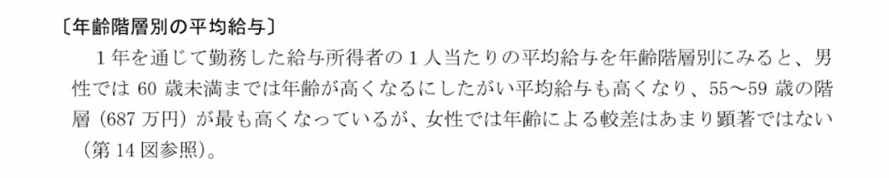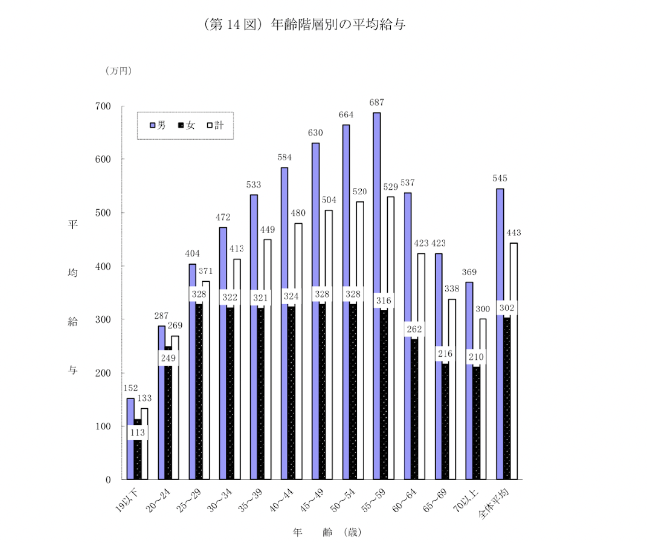 資料によると男女計の平均年収が最も高くなるのは55歳~59歳の529万円です。男性も55歳~59歳の時が最も高く687万円、女性は25歳~29歳、45歳~49際、50歳~54歳の時で328万円でした。