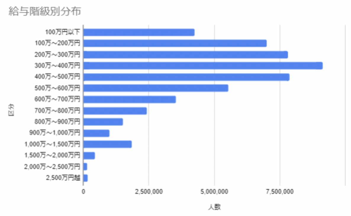 給与階級別分布とは、給与額ごとに「100万円~200万円」「300万円から400万円」などの区分を設け、各区分にどのくらいの給与所得者がいるのかをまとめたものです。