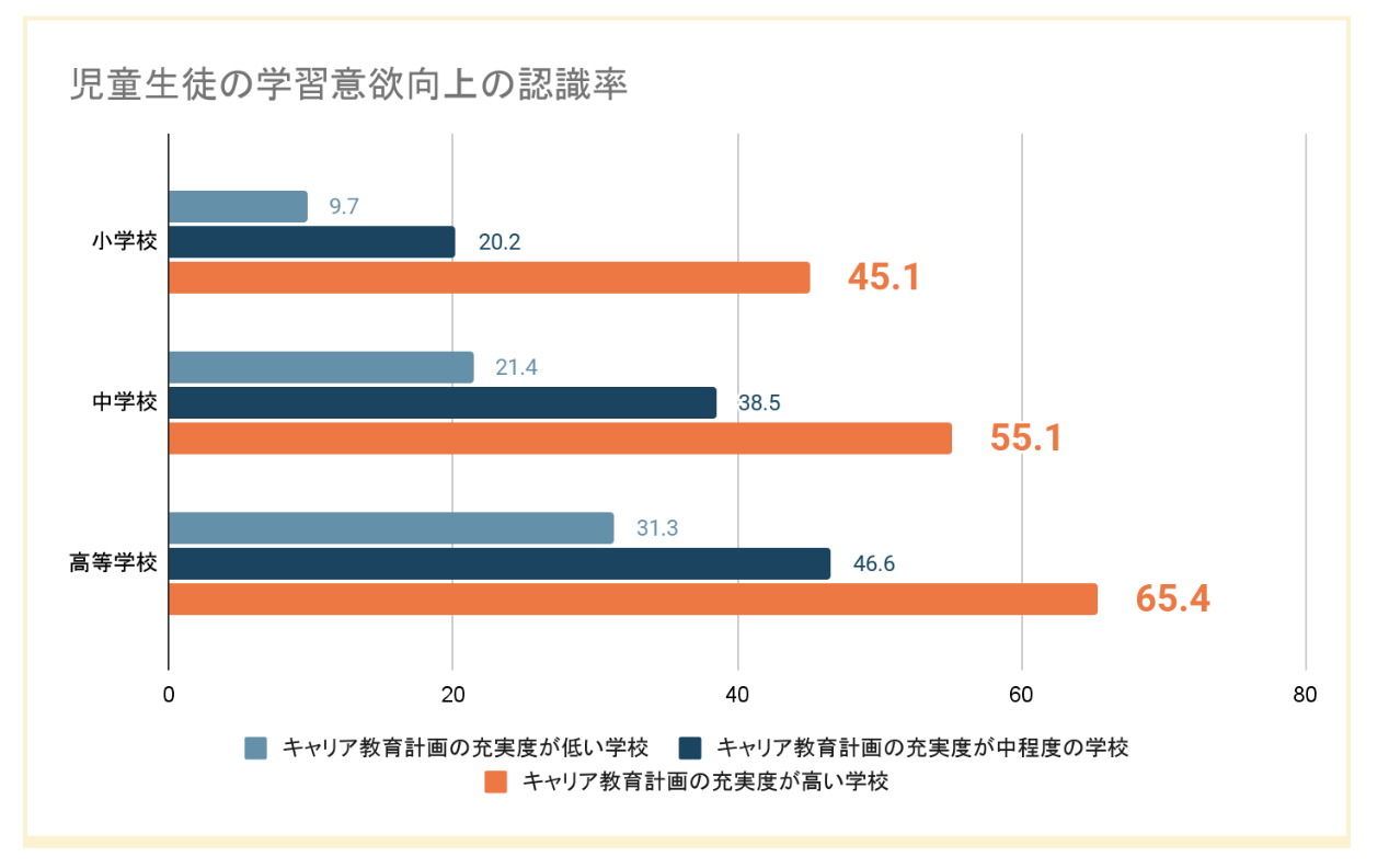 文部科学省国立教育政策研究所が2014年に実施した「キャリア教育・進路指導に関する総合的実態調査」において、キャリア教育は学習意欲を向上させる傾向にあるとの結果を報告しました。中学校においてはキャリア教育の充実度が高い学校のうち55.1%の学校で学習意欲向上が認められ、キャリア教育の充実度が中程度・低い学校と比較し、明らかに差が生じています。