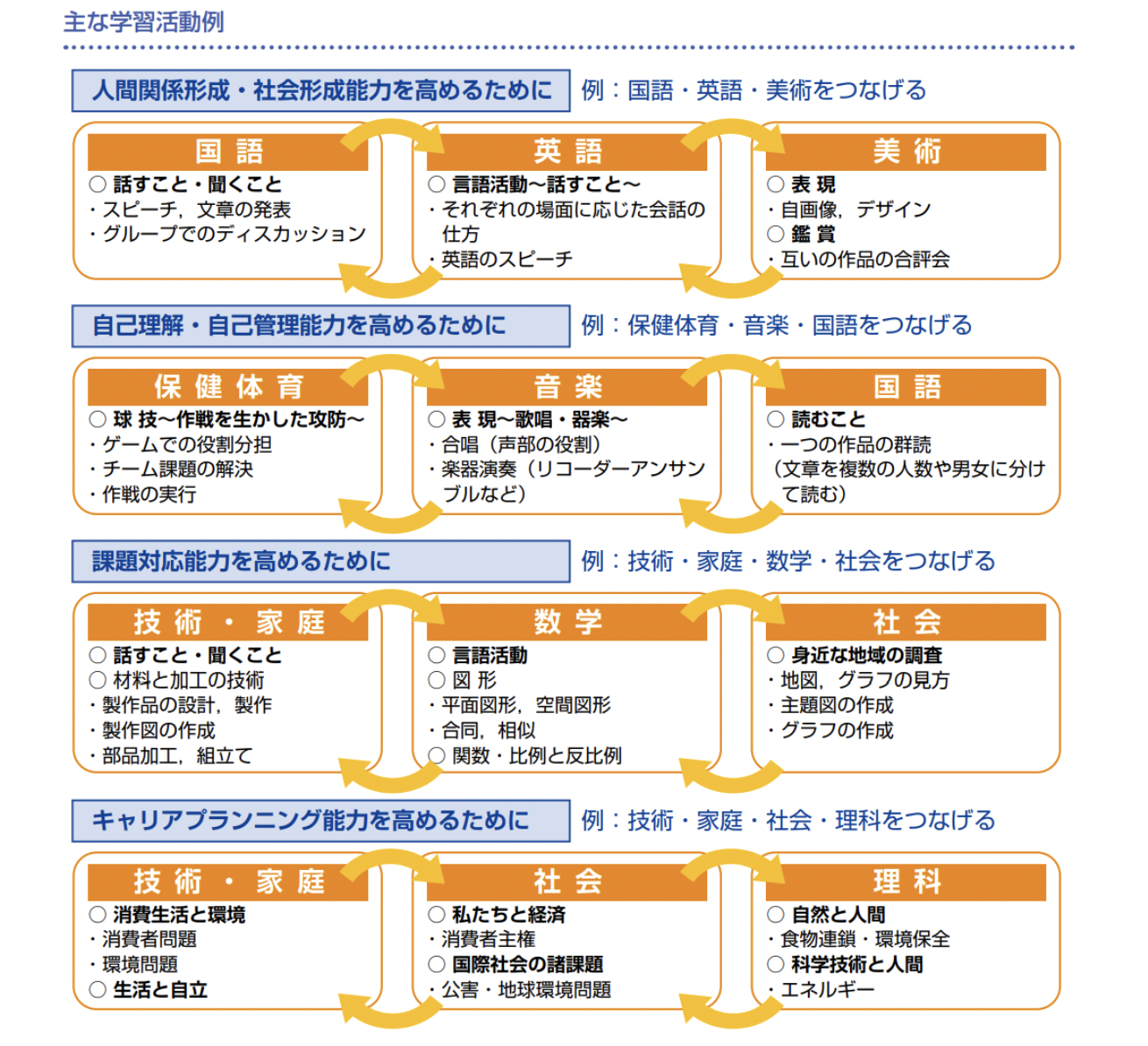 キャリア教育を中学校の各授業と紐づけることで、教育活動の質が高まります。例えば、国語・英語・美術はキャリア教育で育む能力のひとつである「人間関係形成・社会形成能力」に密接に関わっており、スピーチやディスカッションでの話す力や、互いの評価を通して他との関係性を築く能力を育みます。このようにキャリア教育はすべての教育活動と繋げて展開していくことが必要です。その他の教科におけるキャリア教育とのつながりは以下の図の通りです。