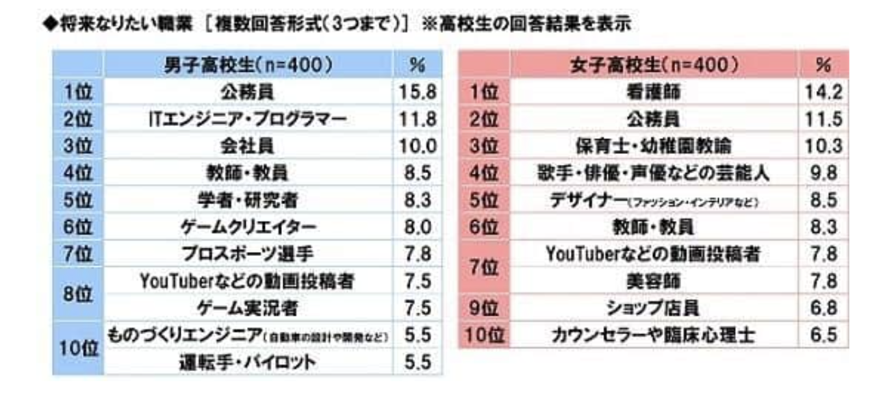 全体のランキングを比較しても、男子高校生の方がより「安定」を求める職業を目指す人が多く、女子高校生は「自分の好き」を活かした職業を目指す人が多いようです。