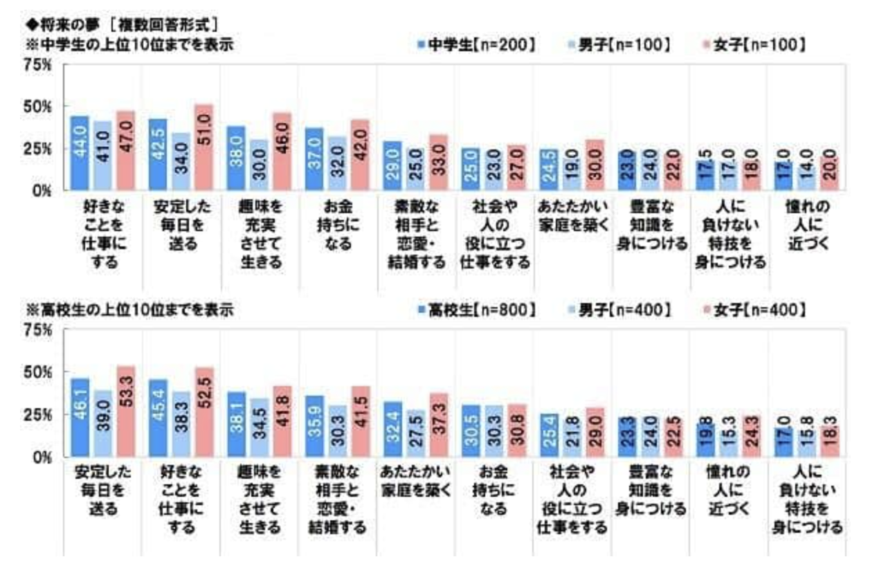 高校生の将来の夢、1位は「安定した毎日を送る」、2位は「好きなことを仕事にする」、3位は「趣味を充実させて生きる」でした。
