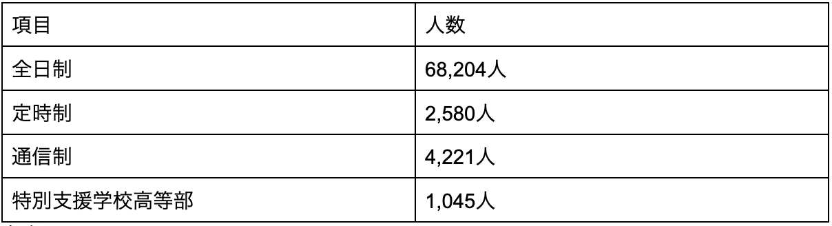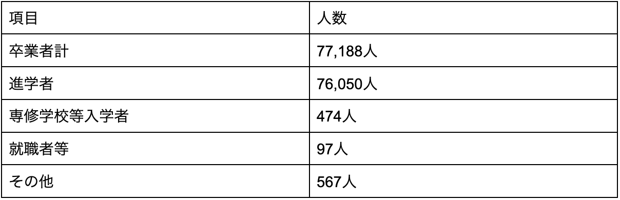 表をみると、卒業者計は77,188人で、高等学校への進学者は76,050人とほとんどの人が高等学校へ進学しているのがわかります。