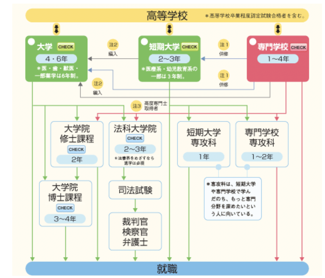 また、専門学校卒でも、条件を満たし「高度専門士」という称号を取得すると、大学院の受験が可能になります。(図の注3)