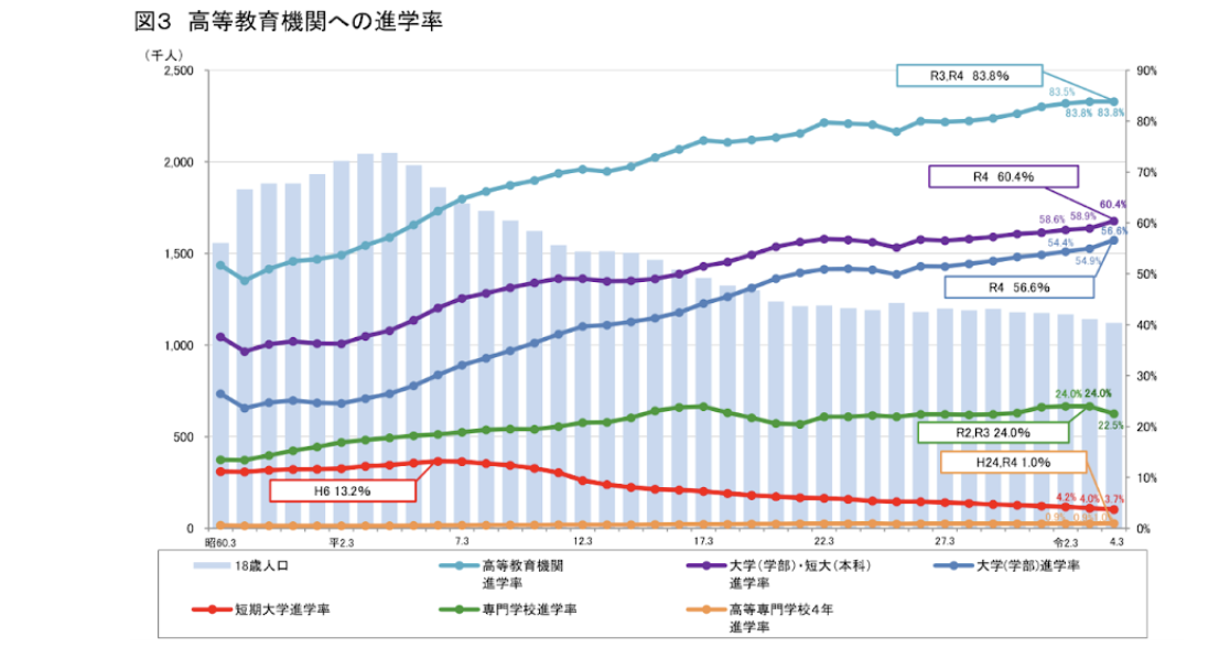 グラフからは18歳人口と反比例して進学者が増えていることがわかります。就職のために進学をする人も多いですが、より多くのことを学び、将来の可能性を広げたいと考える人もまた増えているのでしょう。