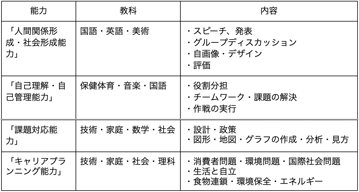 キャリア教育は各教科と密接に関わっており、結びつけることでより質の高い教育活動が可能です。以下のように中学校の各教科の内容と各能力は関係しています。