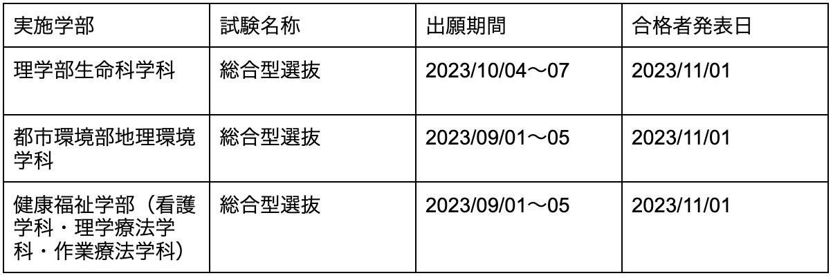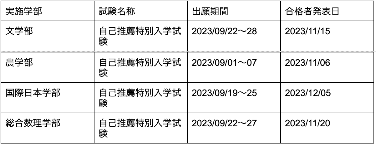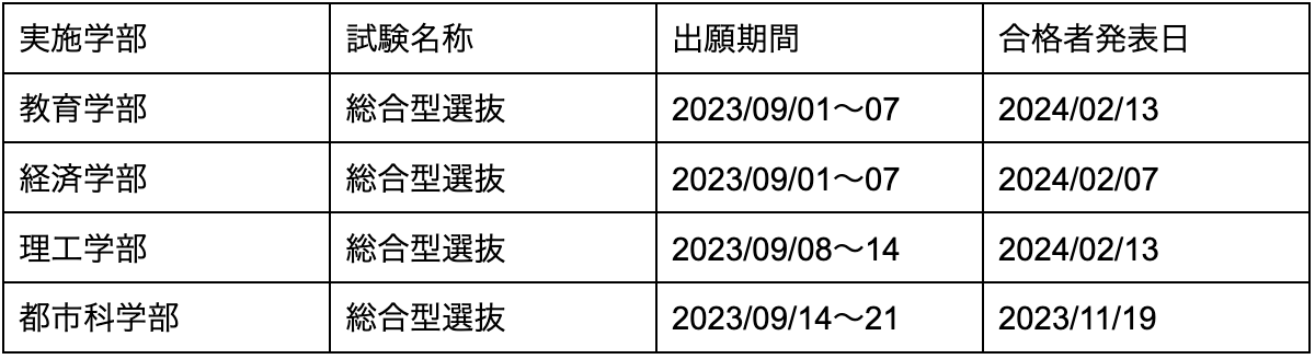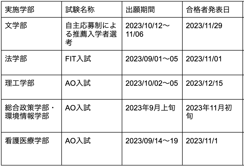 慶応義塾大学の日程一覧は以下の通りです。
