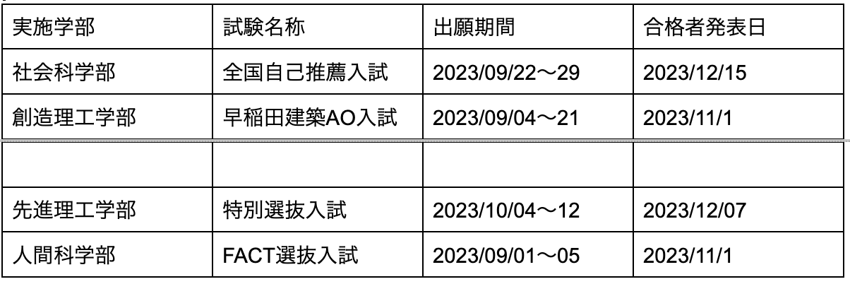 早稲田大学の日程一覧は以下の通りです。