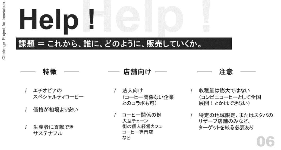 社内の新規事業プログラムにて「希少価値が高く拡販が難しいスペシャルティコーヒー」を商材に新規事業を検討している山崎さんからは「今後事業を拡大していくにあたってどのターゲット層に販売していくべきかを一緒に考えてほしい」といったテーマが提示されました。