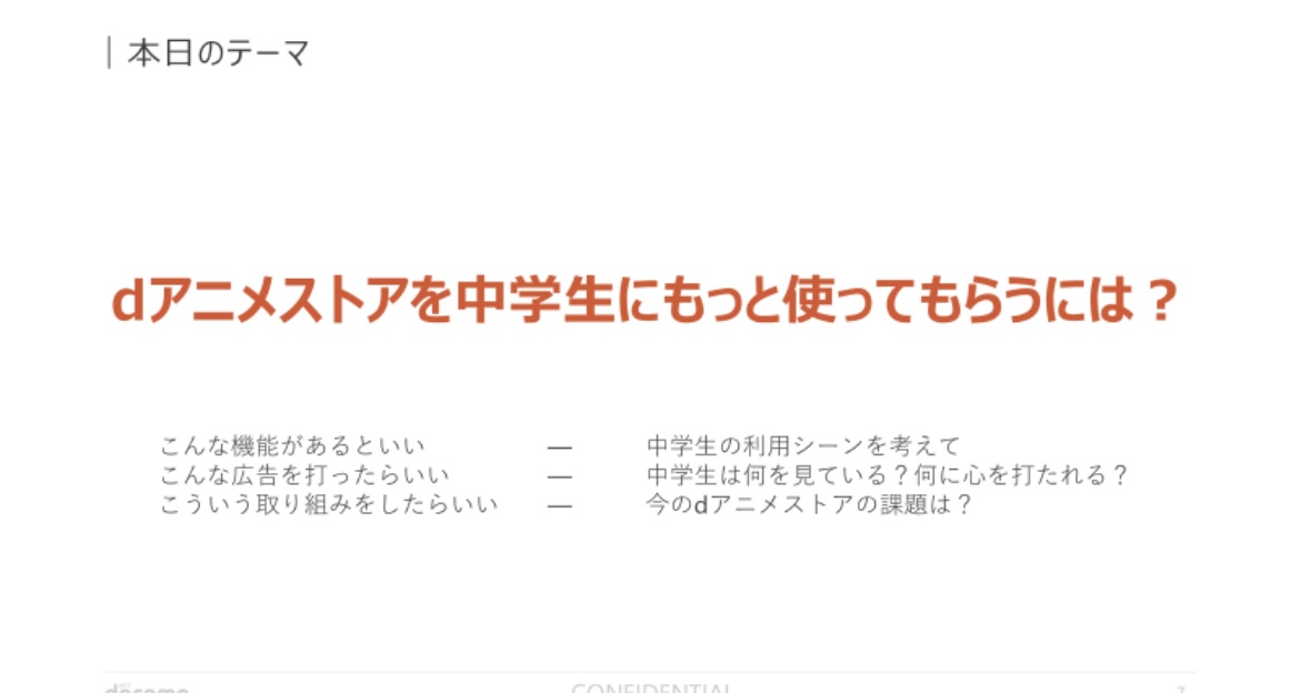 dアニメストアというサービスのマーケティング担当をされている越前さんからは、「どんなサービス内容ならdアニメストアを使ってもらえるか」「競合に勝つためにはどうしたらいいか」といった担当業務で抱える課題が提示されました。