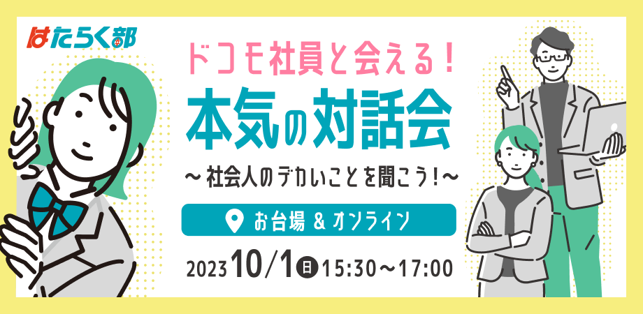 株式会社NTTドコモの社内新規事業創出プログラム「docomo STARTUP」で企画検証された、中高校生向けキャリア教育事業「はたらく部」は、2023年10月1日、docomoR&D OPEN LAB ODAIBAにて社会人と学生の交流イベント「社会人のデカいことを聞こう!」を実施しました。