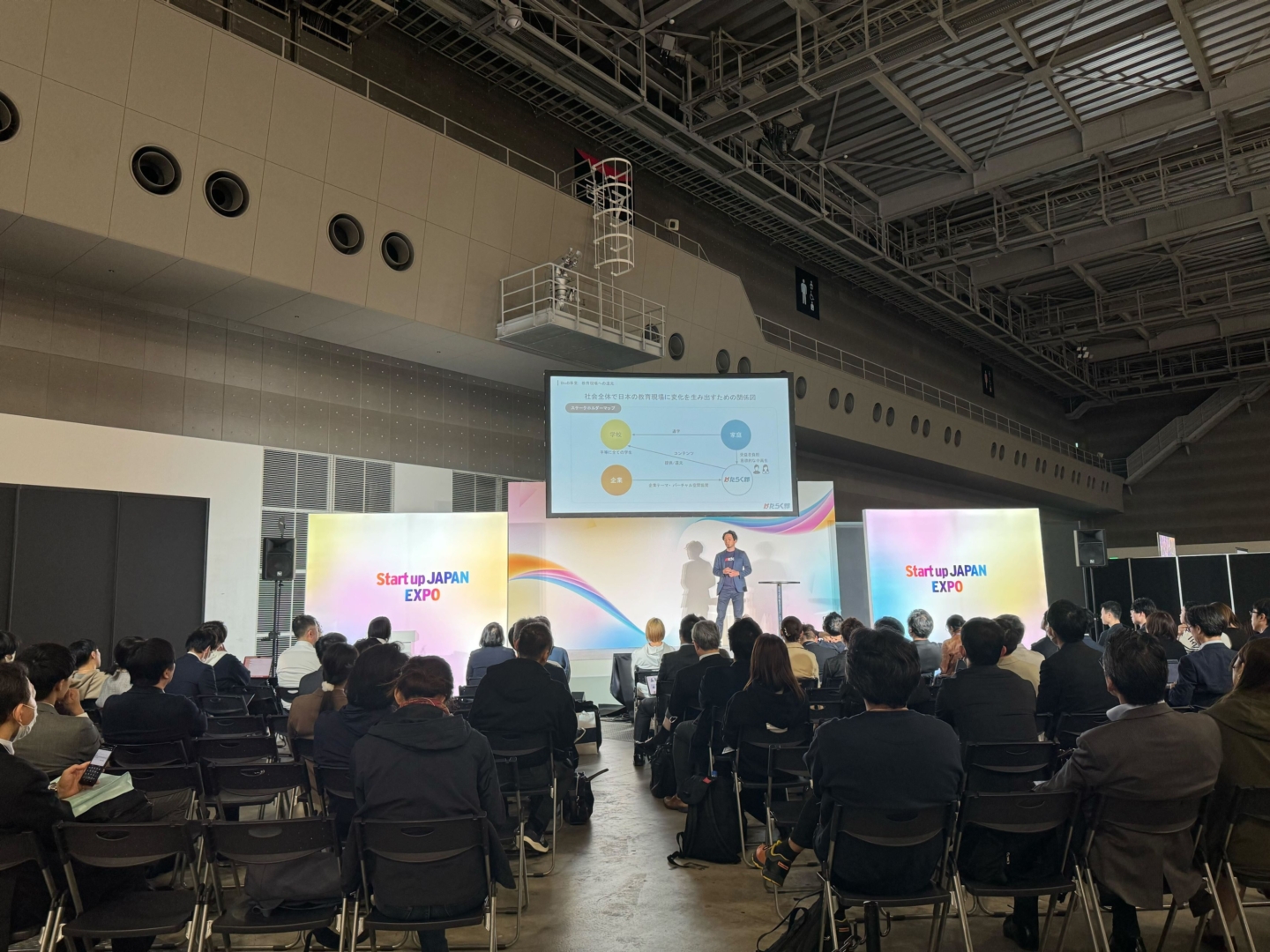 今回のイベントは「イノベーションの原点となる出会いの場」をテーマに開催され、はたらく部では出展ブースでのご案内に加え、スタートアップ各社と共にピッチを通して事業をご紹介しました。はたらく部が提供する、中高生向けキャリア教育部活のプラットフォームについて、サービスを構想する背景や、はたらく部を通して解決したい社会的な課題感、中高生に提供している活動内容に加え、今後の展望について語りました。