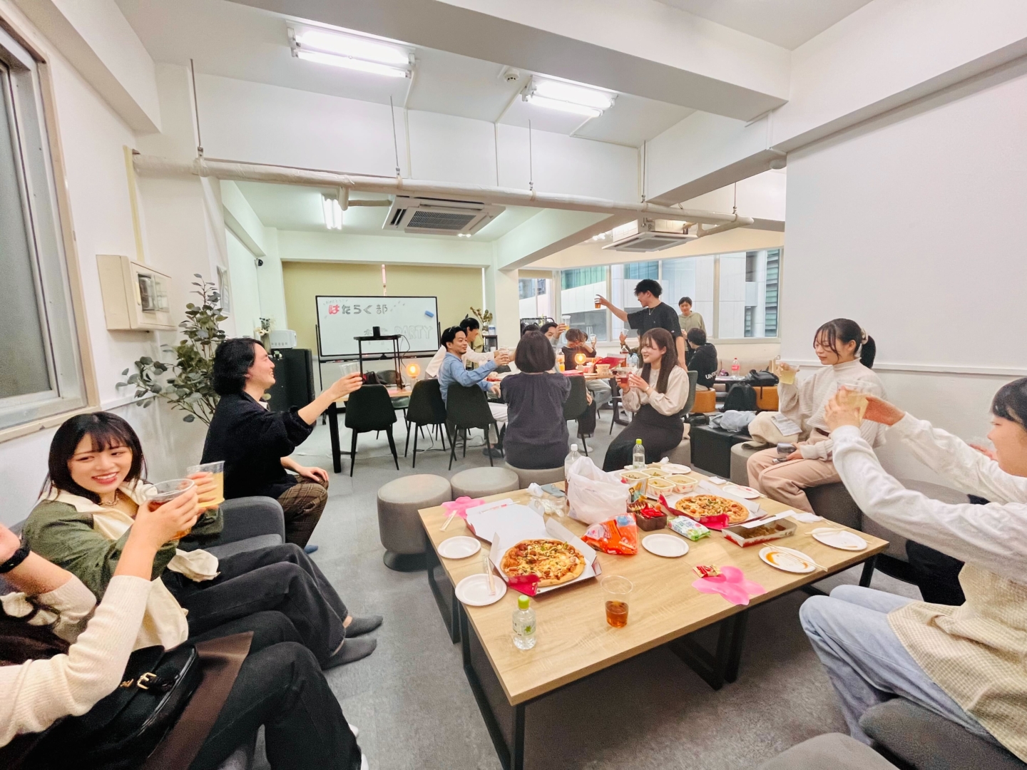 当日は、はたらく部の運営メンバー社会人7名と、学生15名の総勢22名が集まり、高校3年生の門出をみんなでお祝いしました。乾杯のあとは、ゲームをしたり、ピザをシェアしたりと談笑しながら、春から大学生になる高校生からは、将来に向けた真剣な質問も沢山出て、リアルイベントならではのリラックスした雰囲気の中、社会人と学生が一緒にゆっくりと会話する時間となりました。