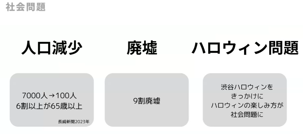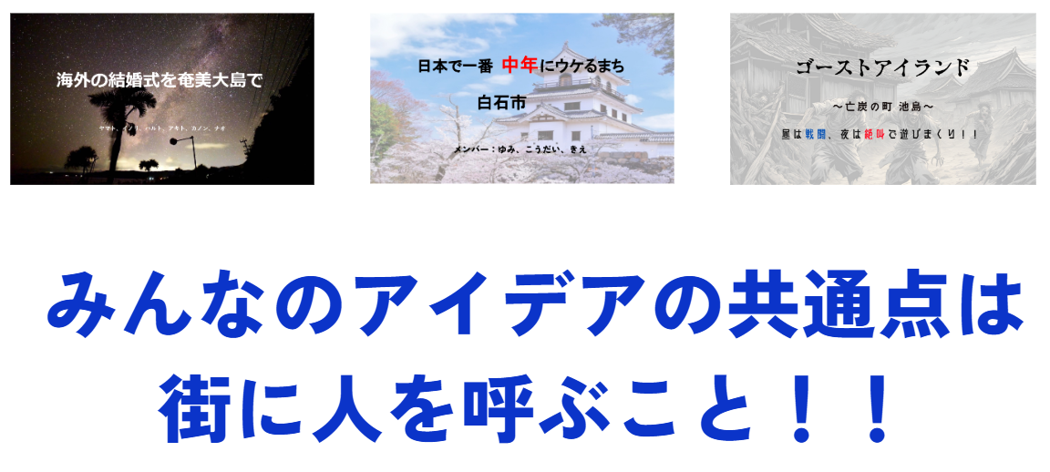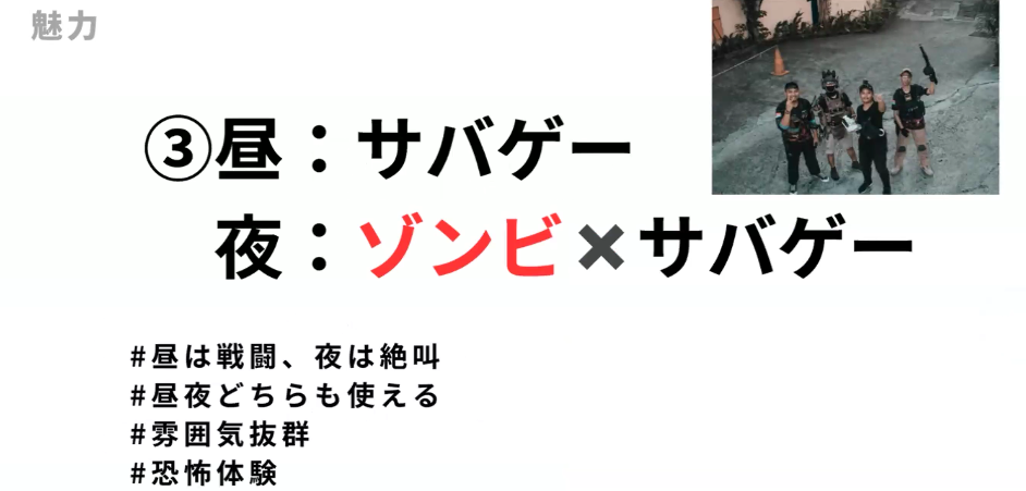 プレゼンの一例として、長崎の池島(世界遺産の軍艦島(端島)と並んで、長崎県のもう一つの主要な炭鉱の島として知られている島)をサバゲーで観光地化するアイデアが発表されました。