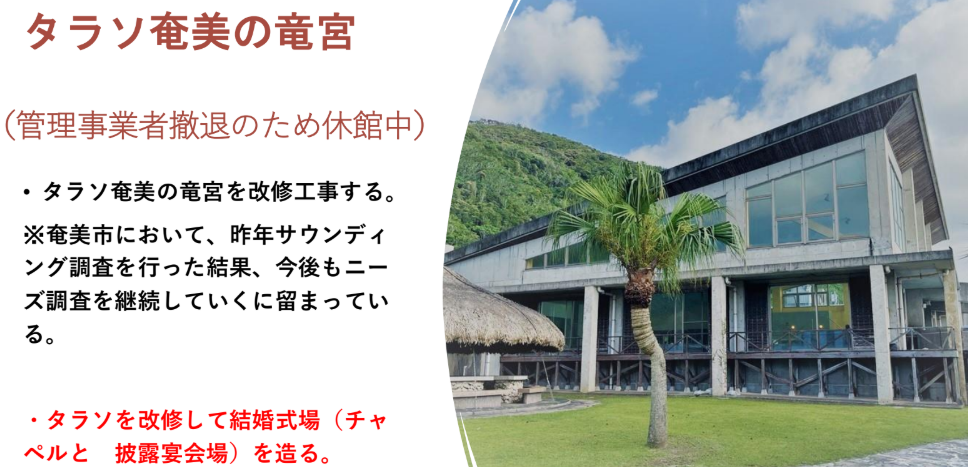 また、結婚式の企画を発表したチームは、アンケートデータを活用したニーズをもとに、立地の利便性や地域の認知度向上、ブランディングや収益性も意識した、日本のハワイと称した奄美諸島での提案を行いました。