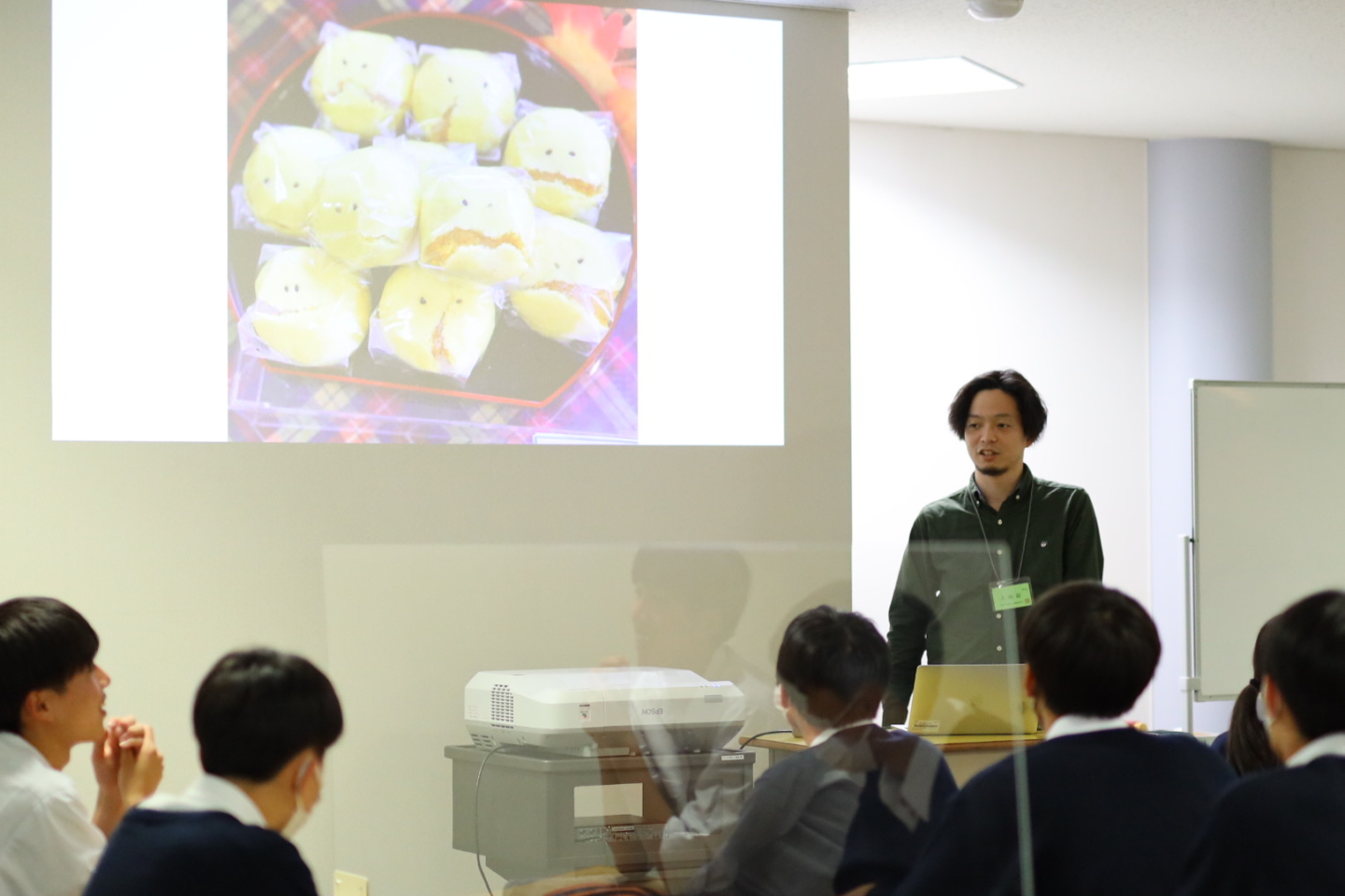 はじめのワークでは、「おまんじゅう屋さんの製造過程で発生した不良品をどうするか?」というテーマで、実際にあった事例をもとに、作る側の目線・買う側の目線で考えました。(破れてしまったおまんじゅうにゴマで目をつけることで、可愛らしい表情ができ、SNSで反響が生まれ、正規の価格で販売ができたもの)この事例のポイントは、付加価値のつけ方や発想の転換は特別な発想ではなく、日常におけるほんの少しの工夫や着想が、ビジネスチャンスになることがあるという学びです。