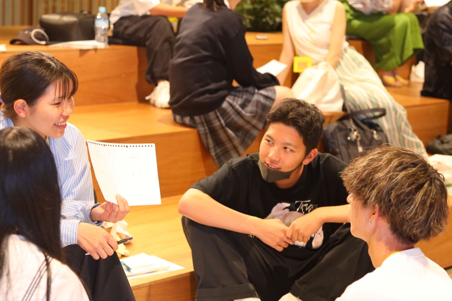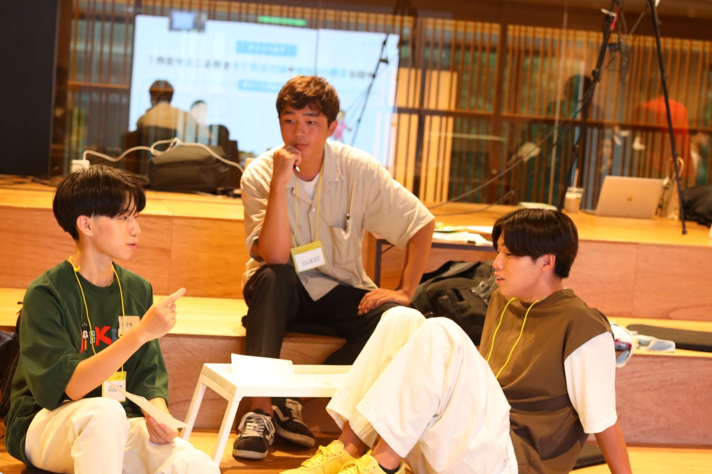 開催場所のユーザベース本社は「作業」する場所ではなく、「共創」する場所として設計されているおしゃれな空間で、本イベントを開催したスペースも、段差がありリラックスして対話できる設計です。時間が経つにつれ、笑顔が増えてきて、笑い声が起きるグループや、真剣に話を聞くグループなど、熱量が生まれていました。