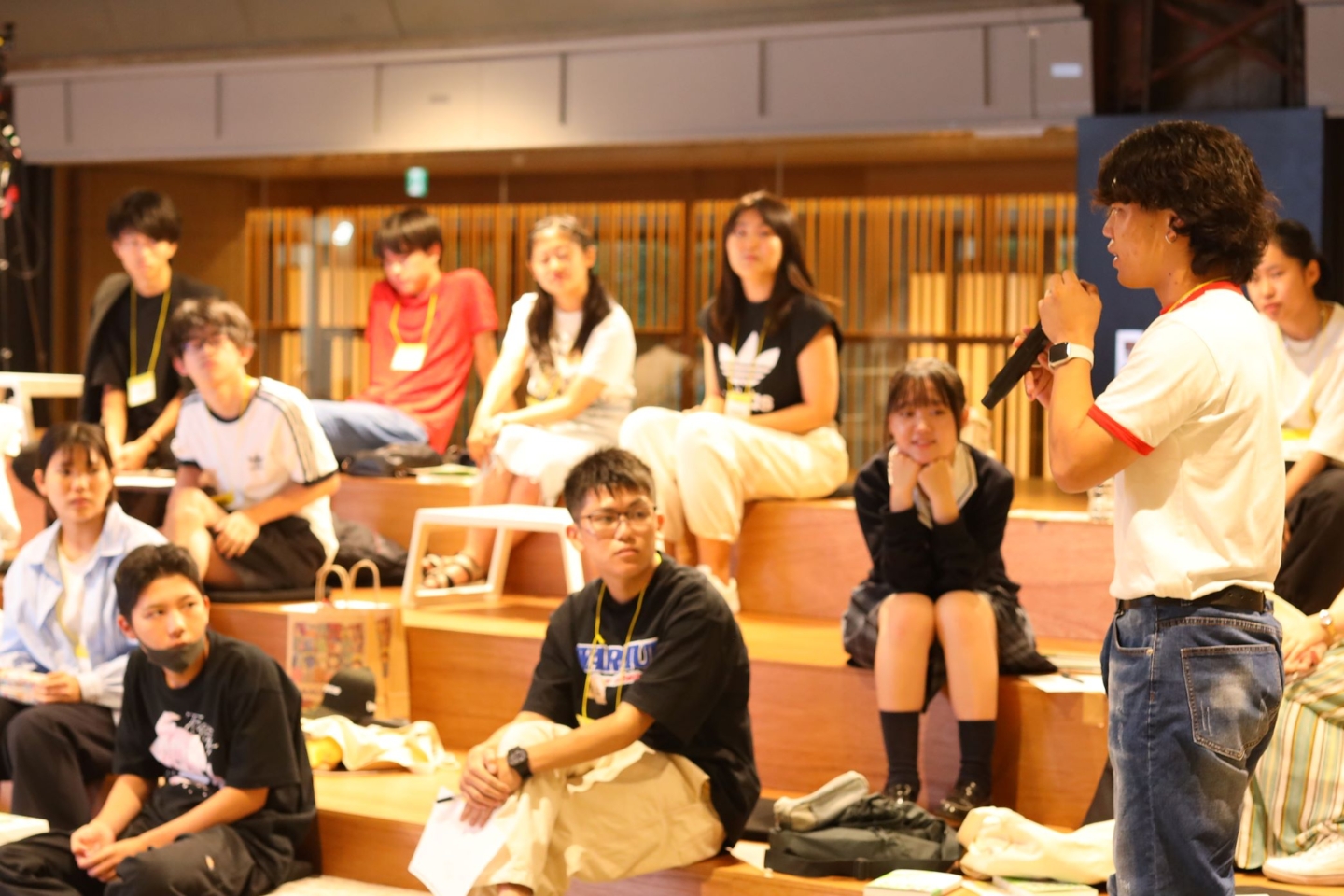 ワークショップの終盤では、数名が挙手して本日の感想を述べました。「海外に挑戦したい」「とくかく目立ちたい」など目標を掲げる生徒や「人前で話すのがあまり得意じゃない」と課題感を話す生徒に「リアクションをもらえるまで継続すること」「まず世の中の人の喜びを知ること、自分からアクションすると仲間ができる」など参加者同士で意見が出るなど、みんなが一人の話に耳を傾ける良い時間となり、最後は会場の一体感も生まれました。